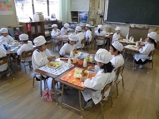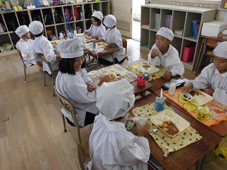 10月11日(水)今日の献立は、ハヤシライス、野菜サラダ、ソフト黒豆、牛乳です。ソフト黒豆は、今回初めて給食に登場した献立です。甘くて、みんなおいしいといって食べていました。モリモリ食べて、健康な体をつくりましょう。
