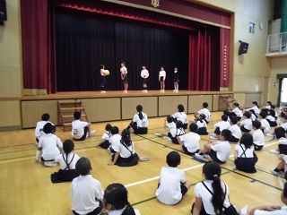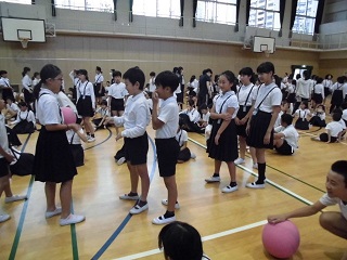 10月12日(木)朝の児童集会は「じゃんけんボール送りリレー」ゲームでした。まず、集会委員が見本を見せました。ルールは、いつものスマイル班(たてわり班)で一列になり、先頭のリーダーがボールを持ち、2番目の子どもとじゃんけんをします。勝てば2人分後ろへボールを送り、負ければ1人分前に戻します。これを繰り返し、最後の子どもまでボールを送れたら全員座ります。どの班も楽しそうにじゃんけんをして、ボールを送ったり戻したりしていました。