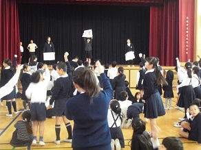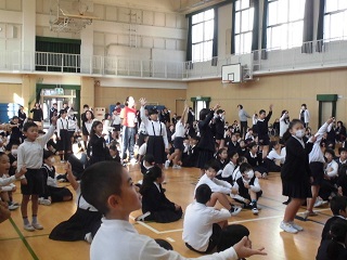 10月26日(木)今日の児童集会は「全校じゃんけん」でした。舞台上の集会委員が「グー・チョキ・パー」の画用紙を掲げ、全校の子ども達とじゃんけんをします。負けた子はその場に座ります。勝ちとあいこの子はそのままじゃんけんを続けます。じゃんけんをするたびに歓声が上がりました。最後まで残った子にみんなで拍手!