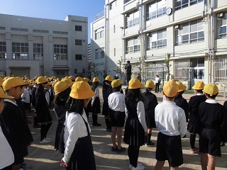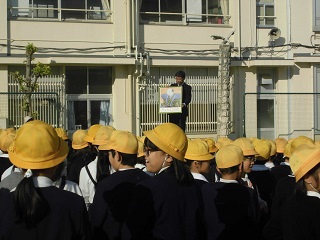 11月6日(月)暖かい日差しを受けて、校庭で児童朝会を行いました。今日の人物は「伊能忠敬(いのうただたか)」を紹介しました。いつも最初は名前を伏せて写真や絵を見せて、人物名をたずねるのですが、今日は20人ぐらい手が挙がりました。さすがに6年生が多く、「伊能忠敬」と答えてくれました。江戸時代、日本地図を作るために55歳から4万キロを歩いて測量した努力と苦労を話すとともに、「千里の道も一歩から」ということわざを紹介し、夢や願いを実現させるためには少しずつの努力を積み重ねることが大切であることを言いました。生活指導部の先生からは、11月から下校時刻が16時10分になったことと、日が暮れるのが早くなり、家にもできるだけ早く安全に帰るようにと話がありました。