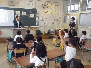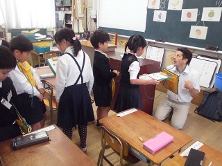 11月8日(水)1・4年生が、外国語活動(英語)を学習しました。1学期も来ていただいたマッツさんが指導に一緒に関わっていただきました。1年生はフルーツの発音や好きなフルーツを調べる活動をしました。4年生は道を進む方法を「go streight」「turn left」などの言い方とアルファベットを一緒に学びました。