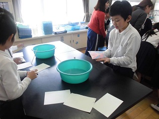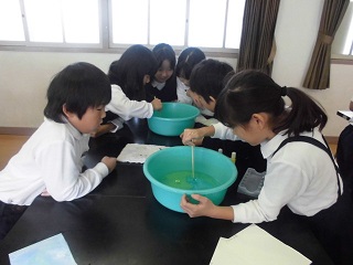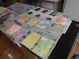 作品展が近づいてきました。どの学年も作品制作に一生懸命取り組んでいます。4年生は、絵画で使われるいろいろな技法を生かした作品に取り組んでいます。技法の一つである、マーブリングに挑戦しました。マーブリングとは、水の上に浮かせた絵具を紙に染めとる技法です。みんな、水面に浮きあがるマーブル模様に喜び、染め上がった紙を見て喜びの声をあげていました。初体験ながら素敵な作品ができあがっていました。