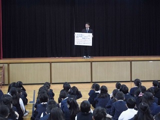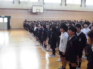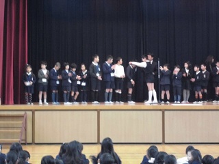 12月25日(月)第2学期の終業式を行いました。今学期にあった運動会や作品展など大きな行事、社会見学や「淀川で遊ぼう」集会などの校外活動、ゲストティーチャーを招いての体験活動などを振り返り、子ども達のがんばりを話しました。また、各学級の2学期のあいさつチャンピオンを1学期のチャンピオンからチャンピンカードをかけてもらって表彰しました。最後に、冬休みの生活について生活指導の先生からお話を聞いた後、みんなで校歌を歌って締めくくりました。