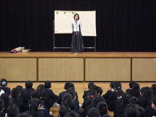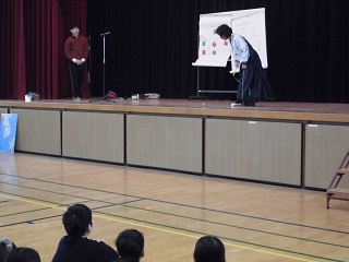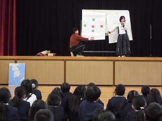 今週は、韓国朝鮮の文化に親しむ週間です。今日の児童朝会には、ソンセンニム(民族講師)の方をお迎えしました。韓国朝鮮の遊びを紹介してもらいました。どの遊びもとても楽しそうです。子ども達は、今週これらの遊びを体験します。