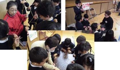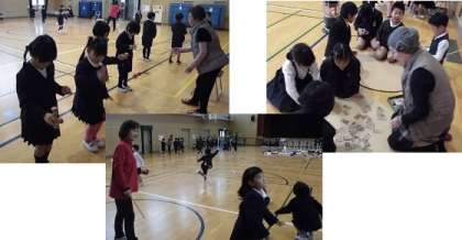 1月17日(水)1年生が2・3時間目に「むかしあそび」を地域の方7名から教えてもらいました。地域の方とご挨拶をした後、けん玉や羽根つき、べったん、あやとり、お手玉、こままわし、おはじきの7つのコーナーをグループで回りながら、やり方を教わって楽しみました。あっという間の2時間でした。最後にお礼をみんなで言いました。「地域の皆様、ありがとうございました。」