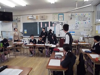 6年2組で学級活動の研究授業が1月22日に行われました。題材は「6年間の感謝の気持ちを表そう」でした。卒業が近づき、小学校生活の締めくくりに人や物に対して、感謝の気持ちを表したいという理由で話し合われました。教職員への寄せ書きや運動場での石拾い、校内そうじなどの意見が出て、みんなで活発な話合いが展開されました。