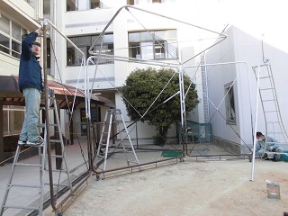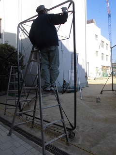 本校の2名の管理作業員さんが、防球ネットの補修をしていました。枠の部分にペンキを塗ったり、ネットを張り直したりして、子ども達が安全で、使いやすいようにしていただきました。