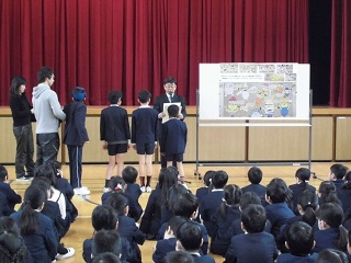 次に、3月1日から行われる大阪市の春の火災予防運動のポスターに本校の児童の絵が選ばれたことを伝え、みんなの前で称えました。