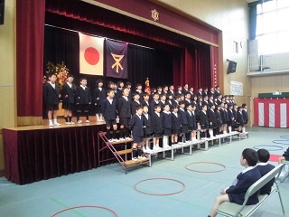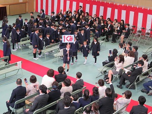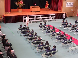 学級担任の先生などの発表をした後、新1年生への歓迎の演技として、2年生が楽しい学校生活のことや1年間でできるようになったことを、呼びかけや実演で発表しました。1年生も興味深そうに見ていました。