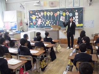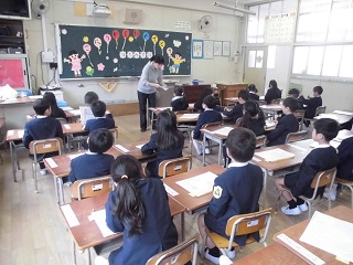 教室でみんなきちんと椅子に座って、先生のお話を聞いたり、配り物を袋に入れたりしていました。お行儀がいいです。