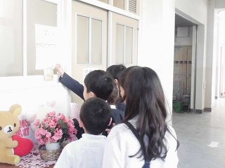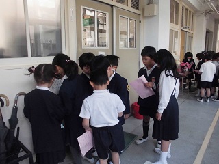 2年生が1年生を誘導して、学校の中のいろいろなお部屋を回ります。行ったところにはカードにシールを貼って、「ハーイ、全部行きました!」みんな仲よくなれましたね。