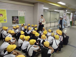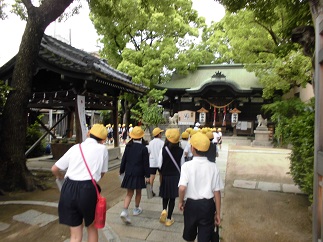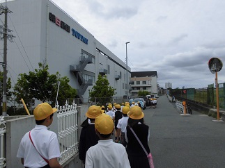 校区の境界になる所をぐるりとめぐりました。淀川の堤防沿いや海老江中公園、八坂神社、野田阪神駅などを歩きながら、自分たちの校区の様子を学びました。