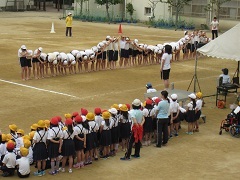 1時間目、5・6年生にお願いして、全校児童に組立体操「Dream 〜夢を持って〜」を見せてもらいました。本番の運動会では、本部とは反対側から見ている子どもたちに、ぜひ正面から演技を見てほしいという思いからです。