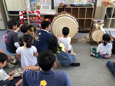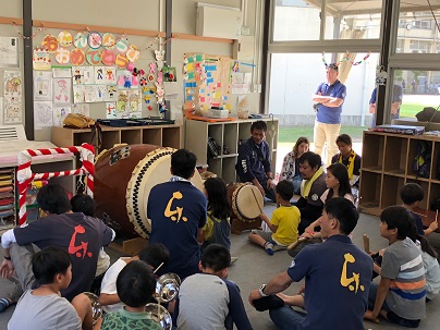 5月12日(土)いきいき活動で、東之町の方に、海老江の伝統である海老江八坂神社のだんじりの太鼓と鐘をもってきてもらい、太鼓と鐘を打つ体験をさせていただきました。東之町の方に打ち方を教えてもらい、一生懸命太鼓や鐘を打っていました。一足早くお祭りがやってきたようでした。貴重な経験ができました。