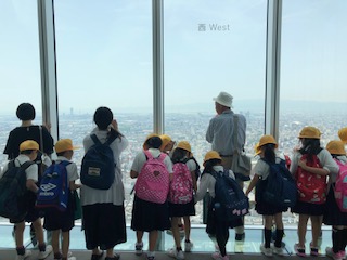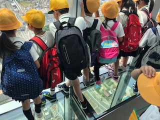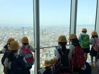 午後からは、あべのハルカスの展望台へ行きました。高速エレベーターで45秒で地上300メートルの展望台に到着しました。お天気もよく、遠くの景色まで見ることができました。見えた建物や名所などを、ワークシートに書き込んでいました。