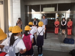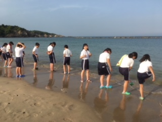 宿舎の志摩ビーチホテルに着きました。開舎式をしたあと、宿舎前の海岸で浜辺の散策を楽しんでいます。海の水はまだ少し冷たいですが、気持ちいいです。