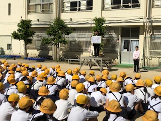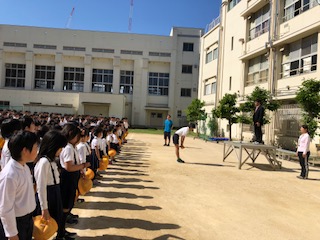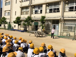 5月21日(月)今日は快晴の運動場で朝会を行いました。