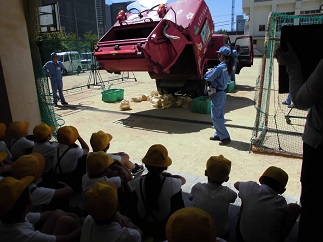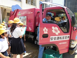 環境事業局の職員の方が来られ、パッカー車(ごみ収集車)のことについて教えていただきました。いろいろな操作の仕方や試乗体験、パッカー車の種類の違いなどクイズも入れながら楽しく学習できました。ありがとうございました。