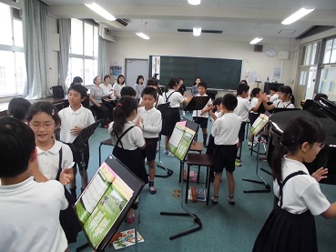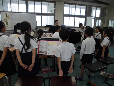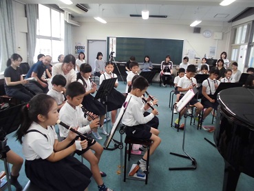 次に、「リコーダーとなかよしになろう」という題材で、シ・ラ・ソの音の出し方を練習した後、「小さな花」を演奏しました。とてもきれいなリコーダーの音の出るようになった子がたくさんいました。