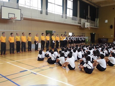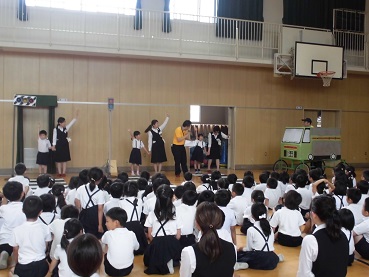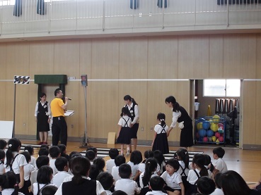 1・2・3年生は、体育館で「道路の正しい歩行のしかた」という内容で、自動車が来た時の注意点と横断歩道の渡り方を教わりました。「自転車の乗り方」についてもDVDを視聴しながら学習しました。