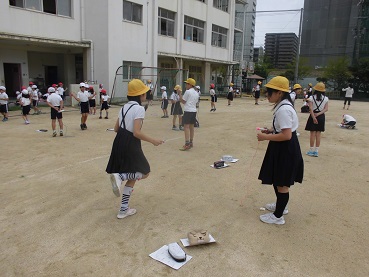 体力ビンゴは、2・3時間目の間の休み時間と昼休みに、運動場4種目、体育館4種目に分かれて、2人か3人組で友達に見てもらいながら交代で記録を取っていきます。