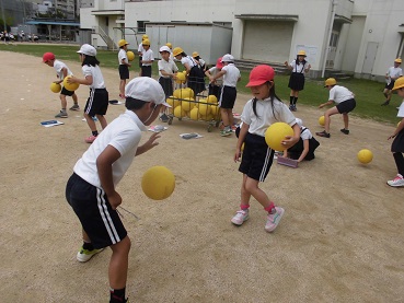 写真は、ボールつき(利き手と反対の手でつく)、てつぼう、バランス(片足立ち)のようすです。