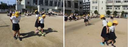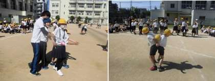 スマイル班ごとのリレーゲームで、異年齢の子どもが二人一組になって、背中にボールを挟んで腕を組み、コーンを回って戻ってくる内容です。
