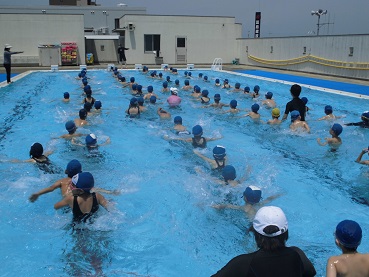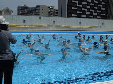 今日は、音楽を流しながら、腕を回したり、かいたりして準備運動をした後、クロールの練習をしていました。