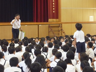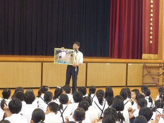 今日の児童朝会では、今回の大雨で被害を受けた方々の様子や亡くなられた方への哀悼の気持ちを伝えました。