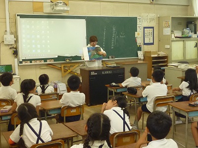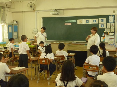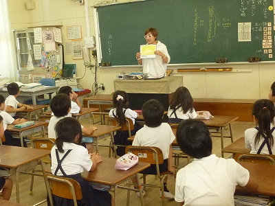 今日もマリア先生に来ていただきました。2年生は、色の言い方を教えていただき、英語で絵本の読み聞かせもしていただきました。4年生は、好きなスポーツや食べ物、飲み物の聞き方、答え方を教えていただきました。