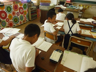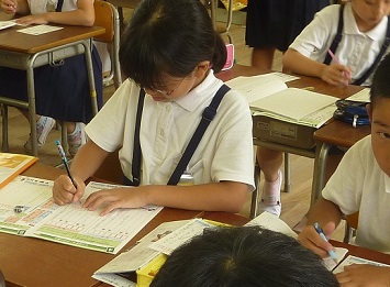 近畿地方郵便局長協会や企業 ・団体等から児童へ暑中見舞いはがき「かもめーる」を寄贈していただきました。全学年、そのはがきで暑中見舞いを送る取り組みをしています。3年生は、「絵手紙」に挑戦しています。まず、はがきのあて名を書きました。書き方を先生に教えてもらい、丁寧に書いていました。どんな絵手紙が完成するのか楽しみですね。