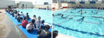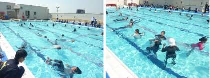 まずは、水着の上から普段着ている服を着てプールに入り、泳ぎにくさを体験しました。