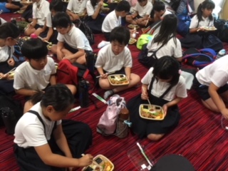 12時ごろにハチ高原に到着しました。今年は厳しい暑さを避けて、宿舎の広間で開舎式をして、昼食を食べています。