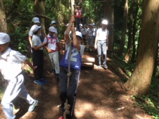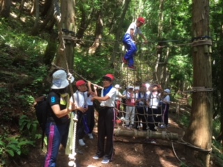 最初の活動は、林の中でアスレチックです。木やロープを使って、いろいろな遊具をスリリングに楽しみました。