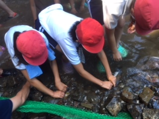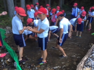 続いての活動は、魚つかみです。冷たい川に入って、泳ぎ回るニジマスをつかんでは、「ワー!キャー!」と大騒ぎでした。