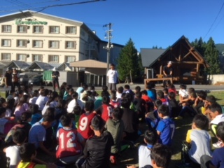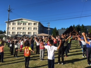 宿舎前の芝生広場で朝の会・ラジオ体操をしています。朝から日差しは強いですが、吹く風は涼しいです。