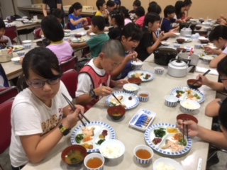 宿舎の食堂で朝ご飯を食べています。8種類のおかずが出ています。しっかり食べて、次の活動を頑張りましょう。