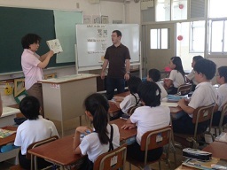 今回は、Hi,friends1 Lesson5「お気に入りのTシャツを作ろう!」の内容で、担任とC‐NETのアダム先生とのティームティーチングによる授業です。