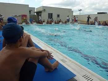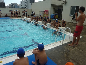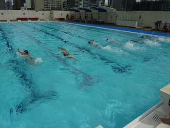 自分の泳力の伸びを確認するため、タイムや距離を計ったり、クラス対抗のリレーをしたりして、最後のプール水泳を楽しんでいました。