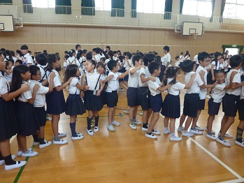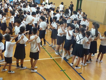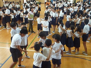 今日は「じゃんけん列車」でした。ゲームのルールは最初にスマイル班の子とじゃんけんをして、勝った子の肩に負けた子が手を置いて二人組でつながります。次に、二人組で移動して、別の二人組の前の子ども同士でじゃんけんをして、同じように四人組になってまた移動します。これを繰り返し、長い列につながっていきます。みんなの心もつながっていきます。楽しそうでした。