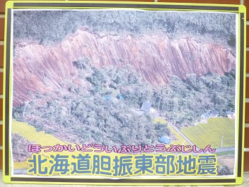 まず、6月18日に起きた大阪北部地震の写真と地図を見せ、壁が崩れ、小学生や見守り隊の方が亡くなったことを伝えました。続いて、9月6日に起きた北海道胆振東部地震の写真と地図を見せ、山が崩れ、麓の民家に大きな被害が出たこと、今も多くの方が救助のために活動されていることなどを言いました。