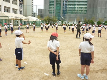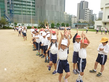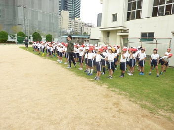 9月12日(水)1・2年生が曇り空のもとで、運動場に出て運動会の練習をしました。