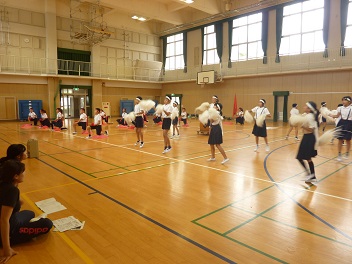 音楽に合わせて応援歌を歌いながらダンスをしたり、太鼓に合わせて力強く腕を突き出したりして頑張っています。担当の先生からいろいろアドバイスももらって、本番が楽しみです。フレー!フレー!応援団