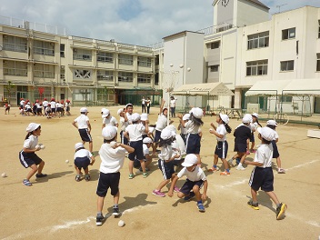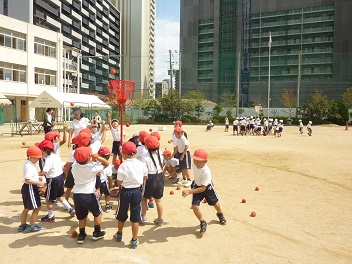 1年生の団体競技は「紅白玉入れ」です。赤組も白組も一生懸命練習しています。