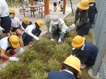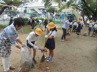 軍手やほうき、熊手、汚物つかみなどを使って、ゴミや落ち葉を取ったり、草ぬきをしたりして、袋にいっぱい集めて終わりました。
