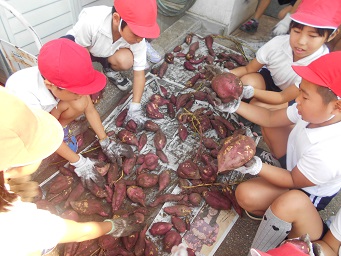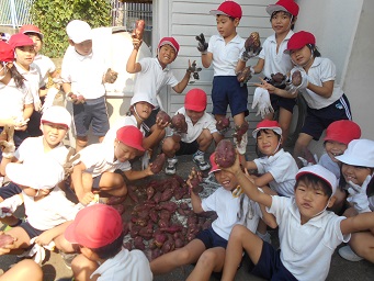10月19日(金)3時間目に2年生が学習園で育てたサツマイモのいもほりをしていました。夏の間に育ったイモが土の中から次から次へと出てきました。中には子ども達の顔ほどありそうな立派なものも出てきて、「わぁ〜!」と驚きの声が上がりました。来週にみんなで味わう予定です。