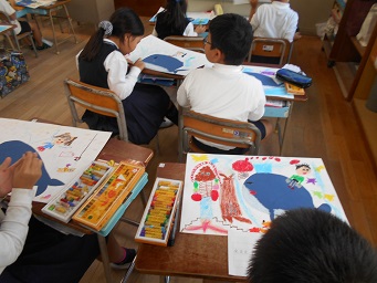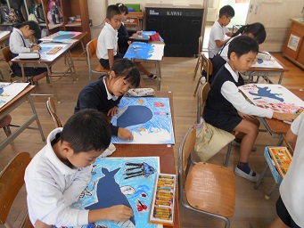 10月30日(火)2年生が図画工作科「クジラにのってでかけよう」の学習をしていました。