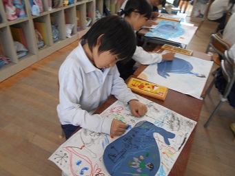 画用紙に大きなクジラの絵を描いたり貼ったりして、クレパスを使ってその周りに色とりどりの人やものを一生懸命かいていました。どの子もクジラの形がちがっていて個性豊かでした。
