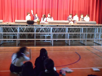 場面ごとのグループに分かれて立ち位置や動作の工夫について打合せをした後、順番に舞台上で演技練習をしました。まだまだ工夫改善点はあるようですが、楽しそうな内容です。