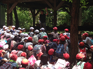 12時半、林の中の涼しいところで飯ごう炊さん、カレーとご飯作りが始まりました。みんなは既に腹ペコです。どんなカレーライスができますか〜。(校長先生のつぶやきより)